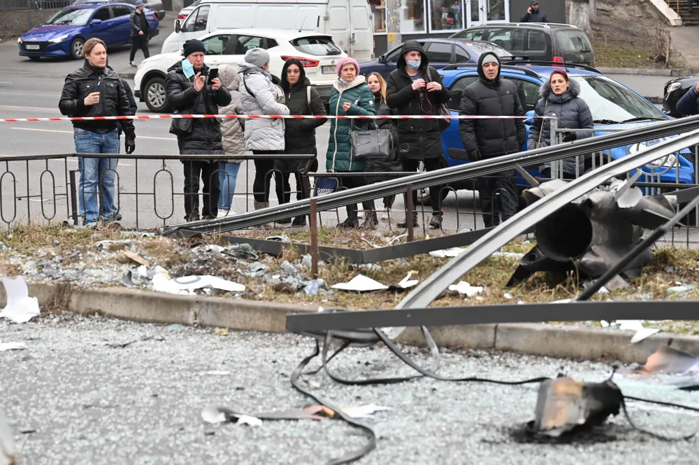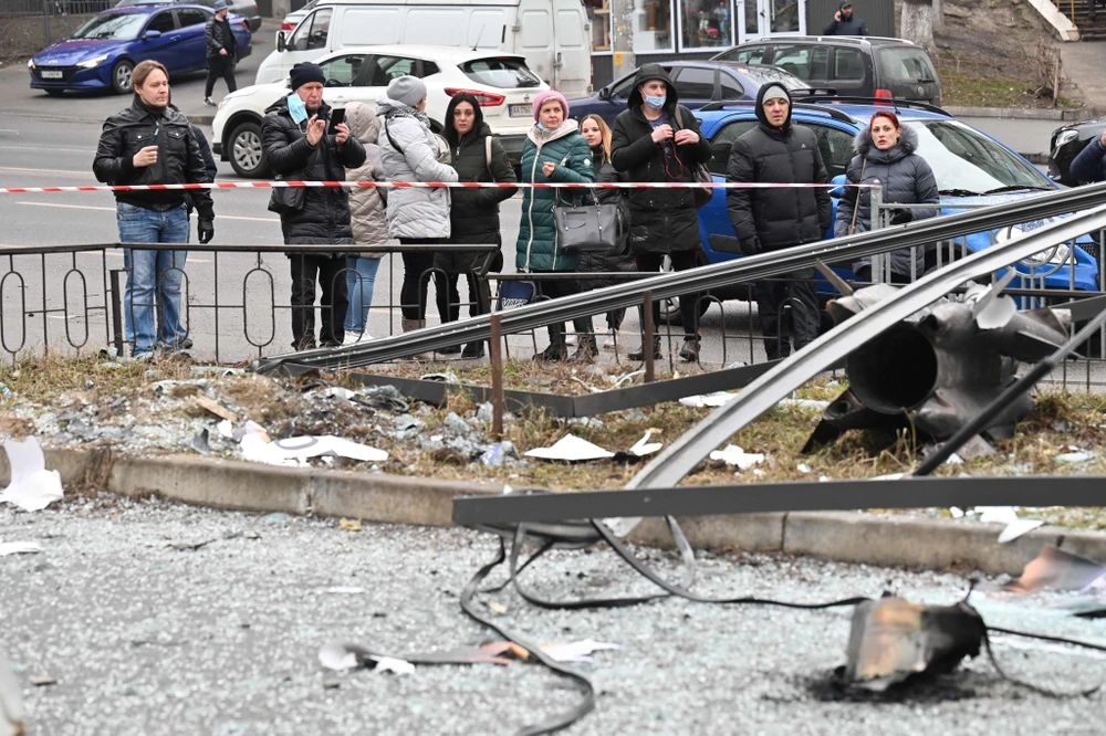 Người dân ở thủ đô Kiev đứng xem hiện trường quả đạn pháo Nga rơi xuống. Ảnh: AFP