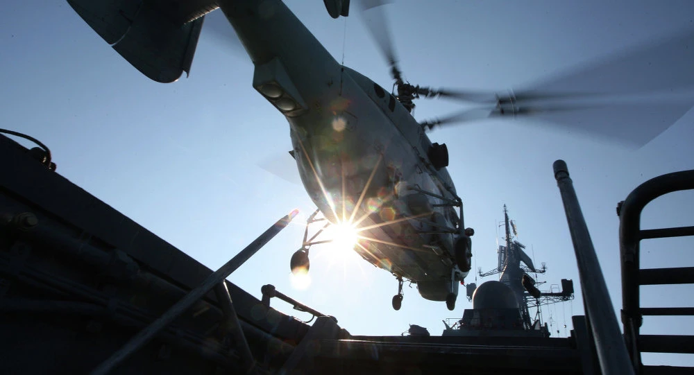 Một chiếc trực thăng đang đáp cánh tại tàu sân bay Nga