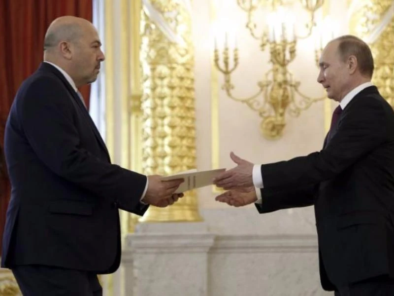 Đại sứ Israel tại Nga Gary Koren (trái) trình thư ủy nhiệm lên Tổng thống Nga Vladimir Putin tại điện Kremlin hôm 16-3-2017. Ảnh: REUTERS