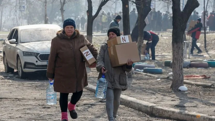 Người dân Mariupol (Ukraine) nhận hàng viện trợ nhân đạo do binh sĩ Nga phát, ngày 23-3. Ảnh: REUTERS