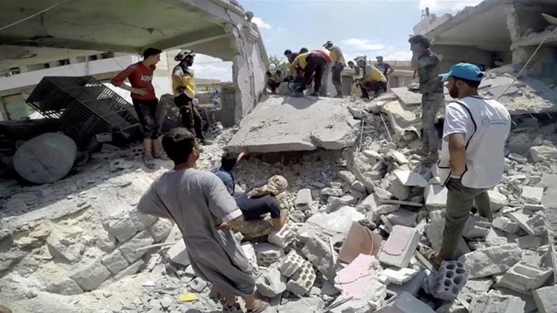 Nhân viên cứu hộ đi qua đống đổ nát ở Idlib sau một cuộc không kích hồi tháng 7. Ảnh: REUTERS
