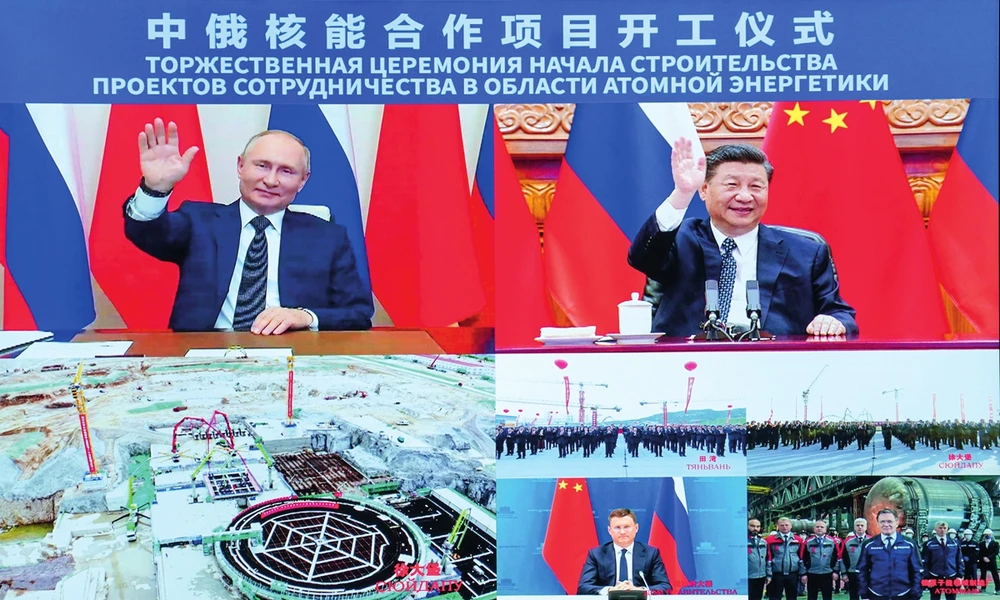 Tổng thống Nga Vladimir Putin (góc trên bên trái) và Chủ tịch Trung Quốc Tập Cận Bình (góc trên bên phải) trong cuộc họp trực tuyến ngày 28-6. Ảnh: TÂN HOA XÃ
