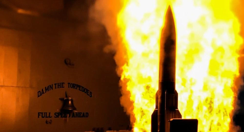 Tàu tuần dương USS Mobile Bay của Mỹ phóng tên lửa SM-2 trong cuộc tập trận. Ảnh: SPUTNIK