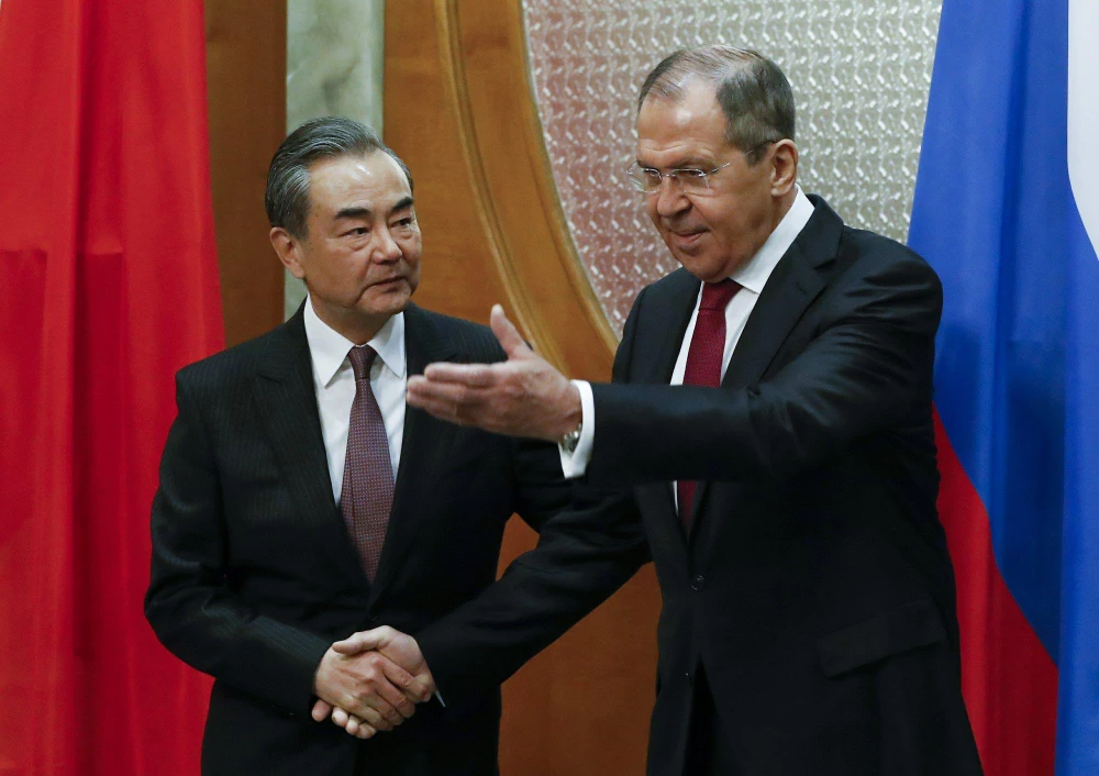 Ngoại trưởng Nga Sergey Lavrov (phải) và người đồng cấp Trung Quốc Vương Nghị tại Sochi ngày 13-5. Ảnh: AP