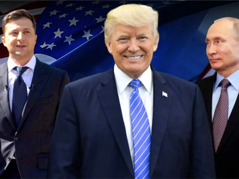 Tổng thống Ukraine Volodymyr Zelenskiy (trái) và Tổng thống Nga Vladimir Putin (phải) có cảm xúc trái ngược về cuộc điều tra luận tội Tổng thống Mỹ Donald Trump (giữa). Ảnh: RFERL