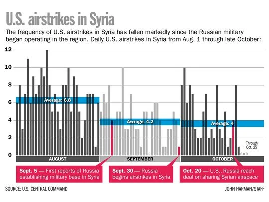 Trong tháng 10, khi Nga bắt đầu các cuộc không kích nhắm vào các mục tiêu ở Syria để hỗ trợ chính quyền tổng thống Bashar al-Assad, số lần không kích của Mỹ và liên minh chống IS do Mỹ dẫn đầu tiếp tục giảm xuống nhưng ở mức nhẹ (bốn lần/ngày), theo số liệu của Bộ Quốc phòng Mỹ từ ngày 1 đến 26-10.