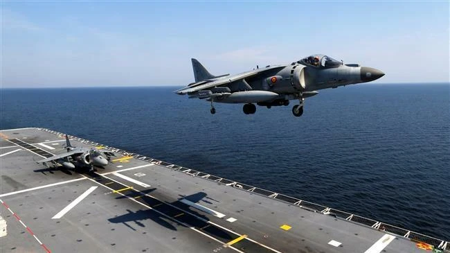Máy bay tấn công mặt đất AV-8B Harrier II của Hải quân Tây Ban Nha hạ cánh trên tàu sân bay LHD Juan Carlos I trong cuộc tập trận BALTOPS 2019 của NATO ở biển Baltic gần Lilaste, Latvia hôm 13-6. Ảnh: REUTERS