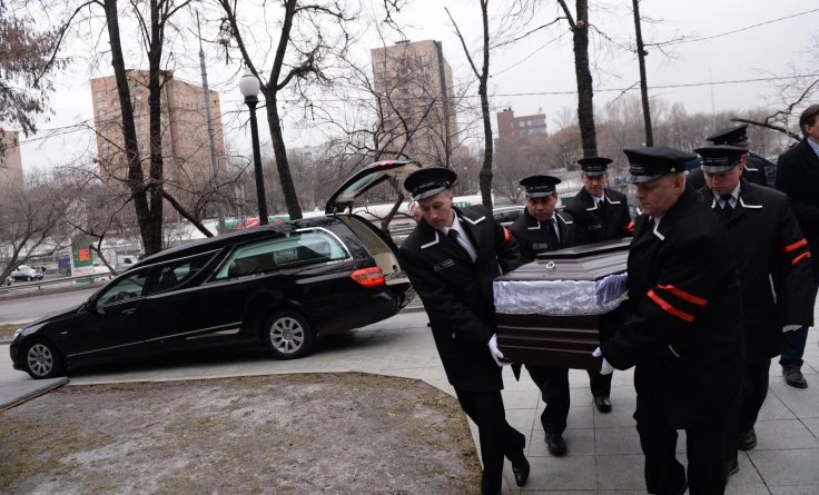 Nhân viên tang lễ di chuyển quan tài của ông Boris Nemtsov trước lễ viếng tại Moscow (Ảnh: AFP)