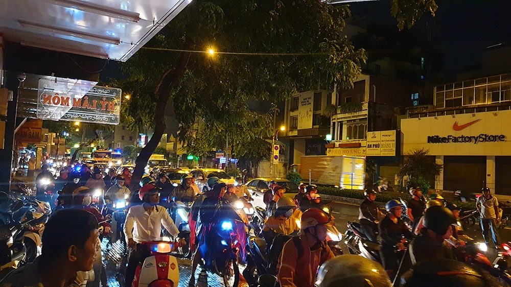 Ảnh hưởng từ vụ tai nạn khiến giao thông qua khu vực ùn ứ trong đêm khuya. Ảnh: NT