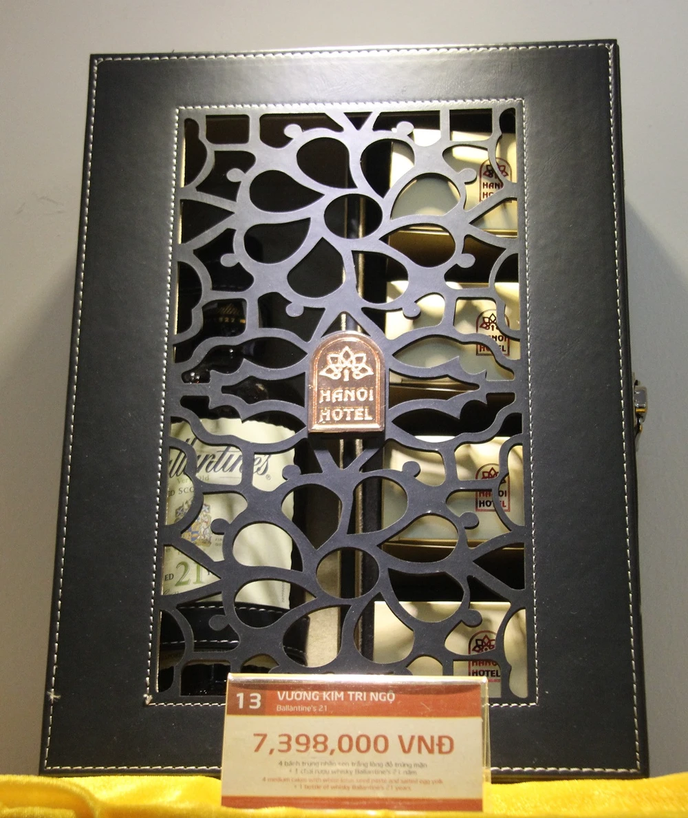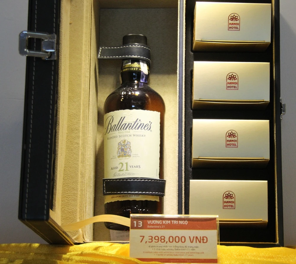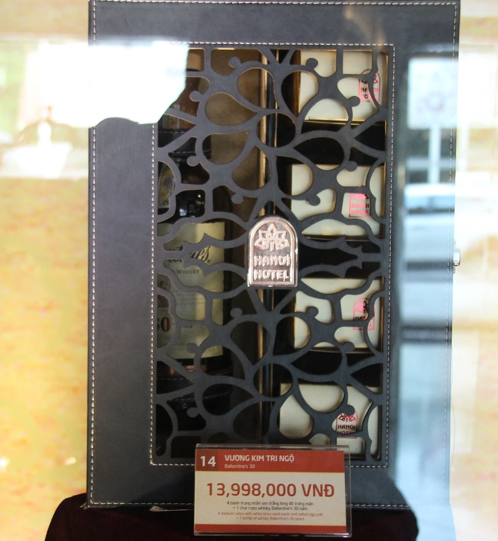 Theo đó, hộp bánh Vương kim chi ngộ 30 của khách sạn này cán mốc 13.998.000 đồng. Hộp bánh gồm 4 bánh trung thu nhân sen trắng lòng đỏ trứng mặn thượng hạng và một chai rượu whisky Ballantine’s 30 năm.