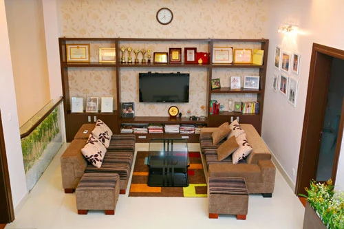 Phòng khách có cây đàn piano và Quyền Linh thường giúp hai cô con gái tập hát.