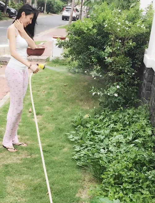 Nơi ở mới gồm sân vườn rộng rãi để cả gia đình có thể thư giãn mỗi khi quây quần bên nhau. Căn biệt thự được mua lại phần thô với giá 5,6 tỉ đồng, sau đó sửa chữa lại nội thất theo ý thích của hai vợ chồng.