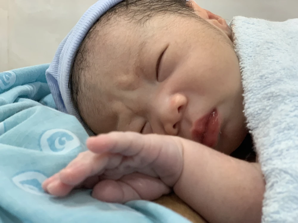 Sau hồi trấn tĩnh, bé trai sinh vào lúc 0 giờ đang say giấc như còn trong bụng mẹ. Ảnh: HL