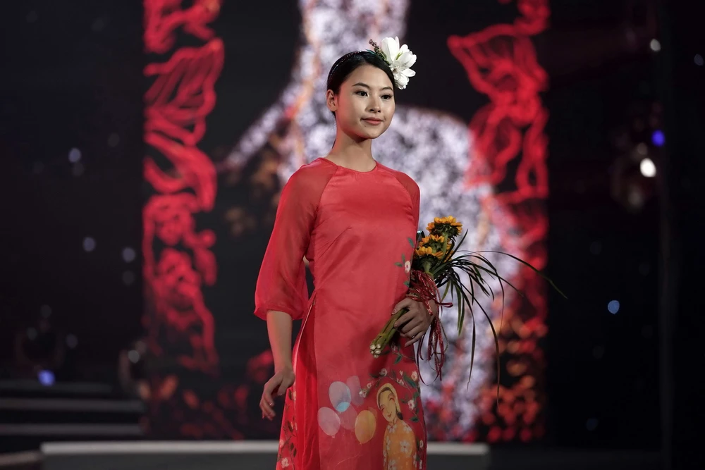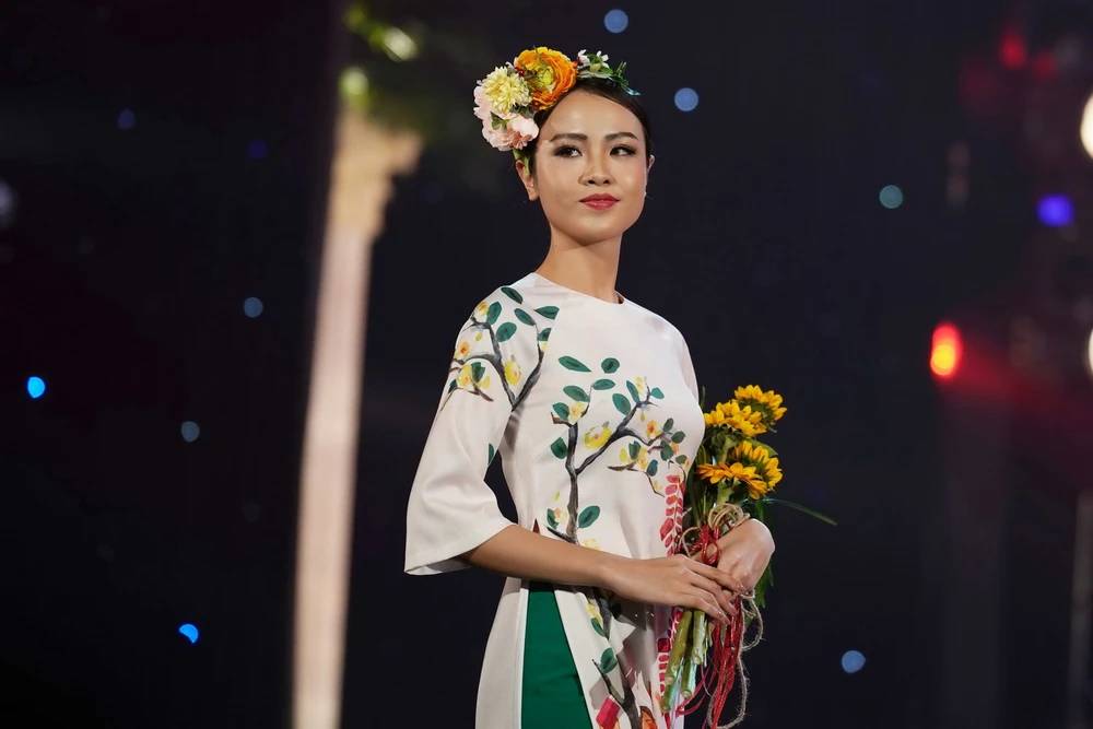 Ý xuân có nét vẽ của họa sĩ Phạm Trinh trên các tà áo dài của Ngọc Hân. Các tà áo thể hiện sinh động hình ảnh đôi nam nữ hân hoan cùng du xuân, trẻ con vui vẻ bên những trò chơi dân gian, hay niềm hạnh phúc đời thường khi gia đình sum vầy, đoàn tụ.