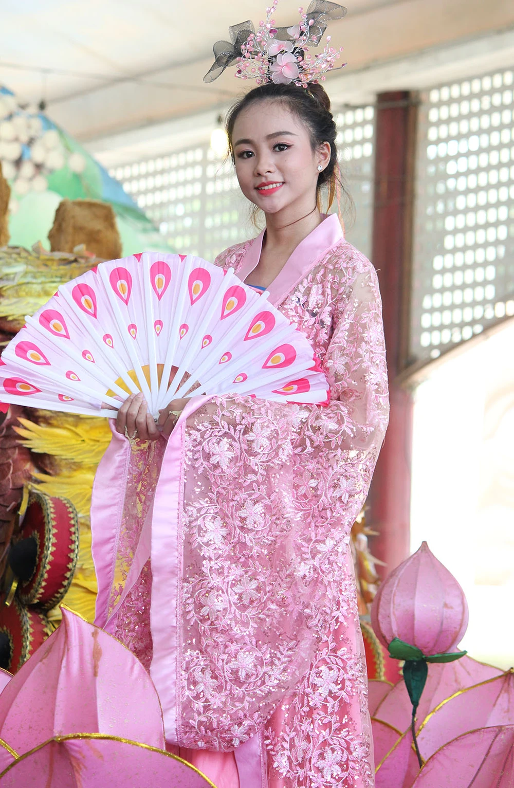 Cô gái nổi bật trong bộ trang phục màu hồng và đứng trên búp sen.