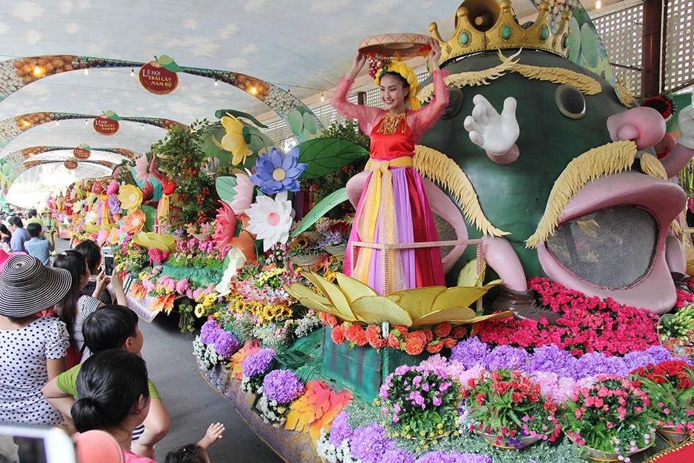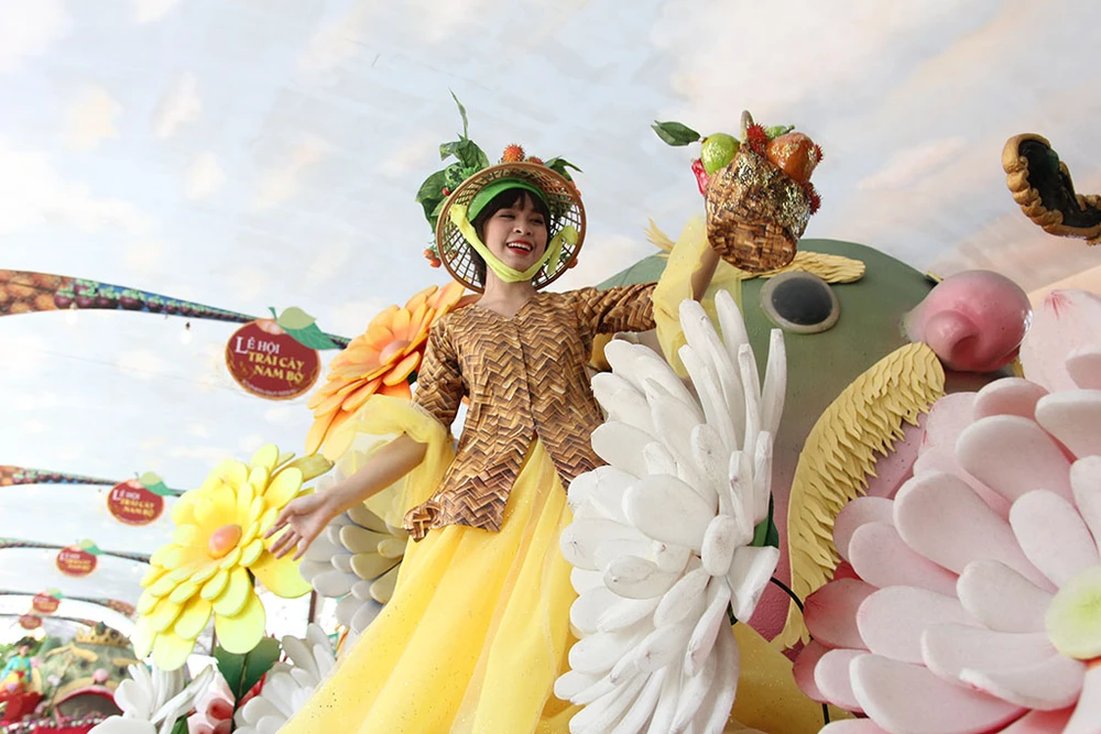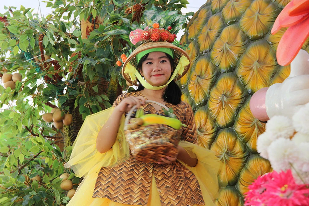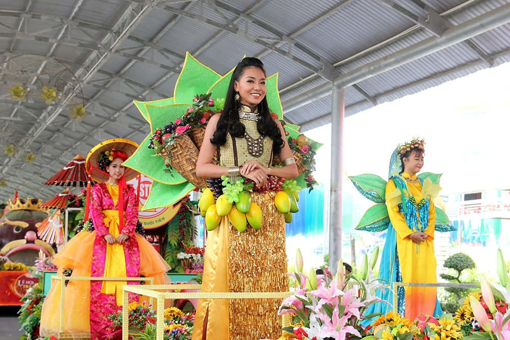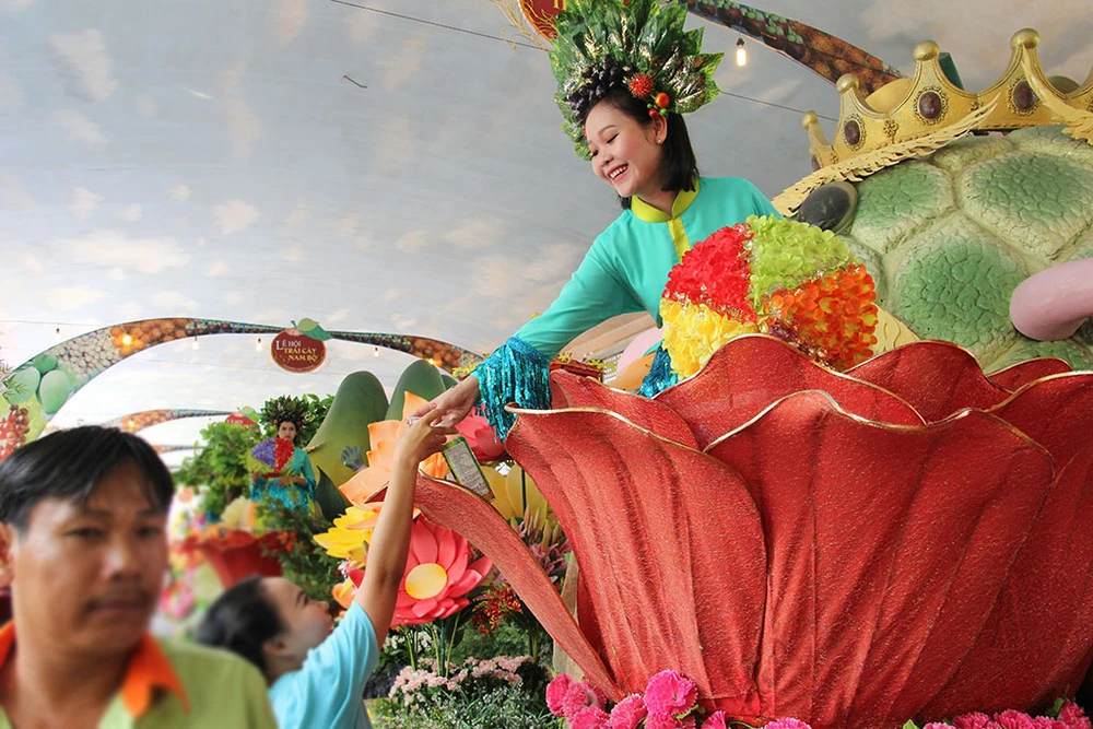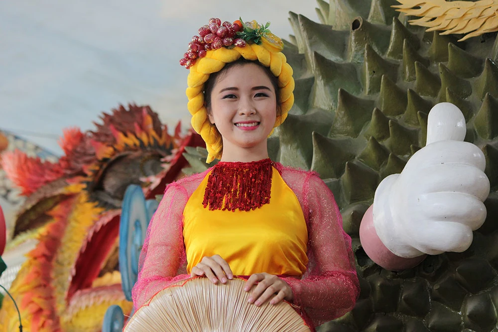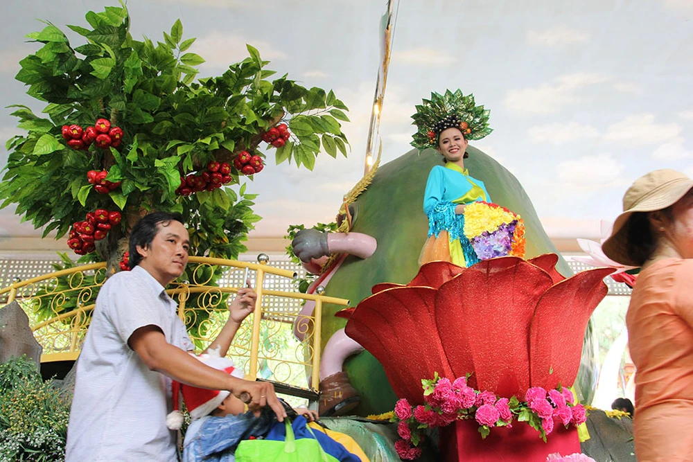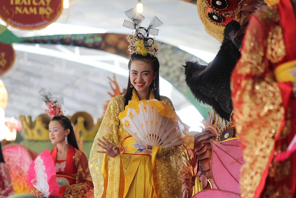 Các cô gái trong trang phục đẹp mắt trình diễn trên những xe chở đầy hoa quả diễu hành qua các tuyến đường trong Khu du lịch Suối Tiên.