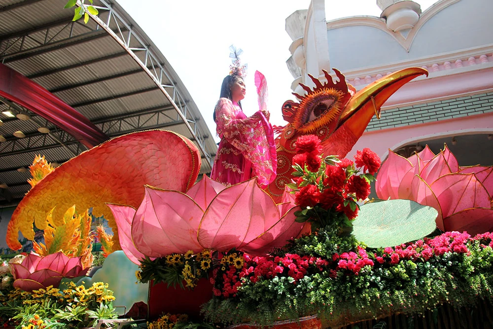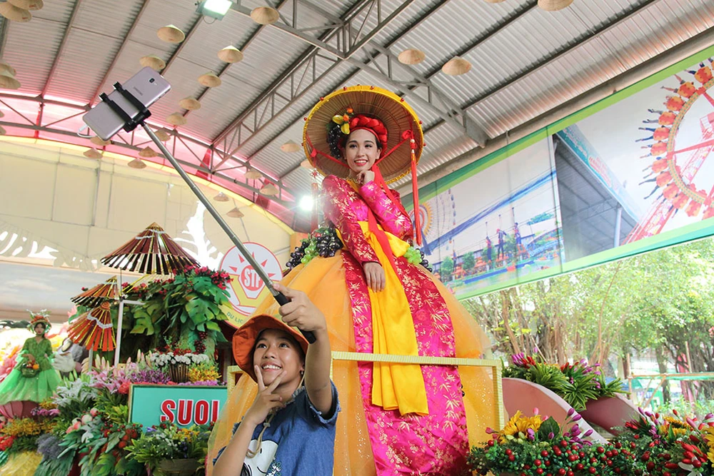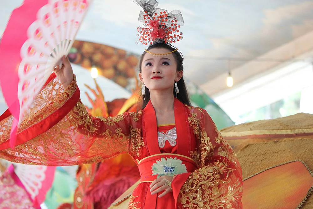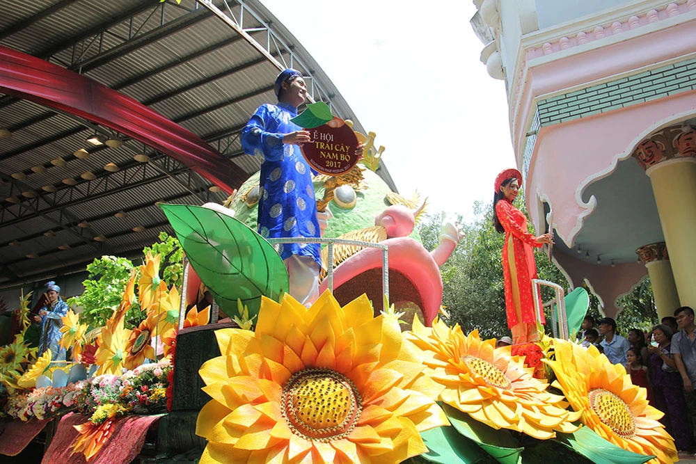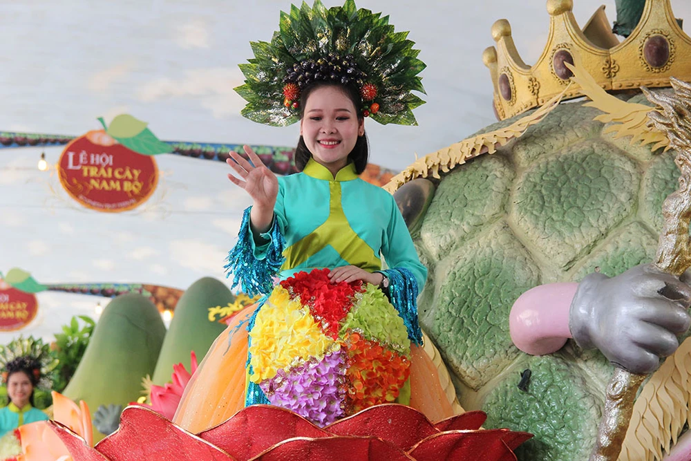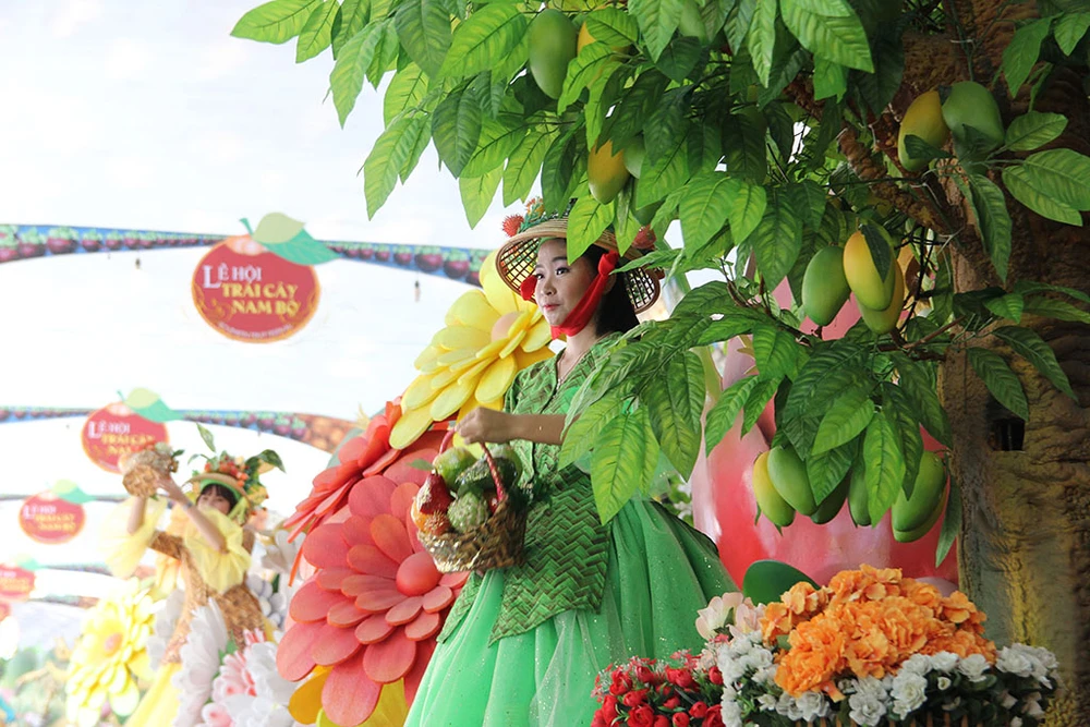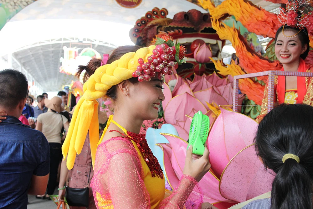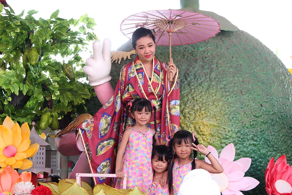 Các cô gái trong trang phục đẹp mắt trình diễn trên những xe chở đầy hoa quả diễu hành qua các tuyến đường trong Khu du lịch Suối Tiên.