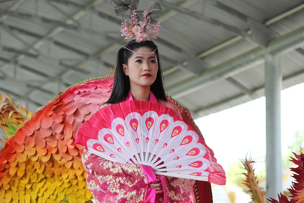 Cô gái diện trang phục sặc sỡ với cây quạt trên tay.