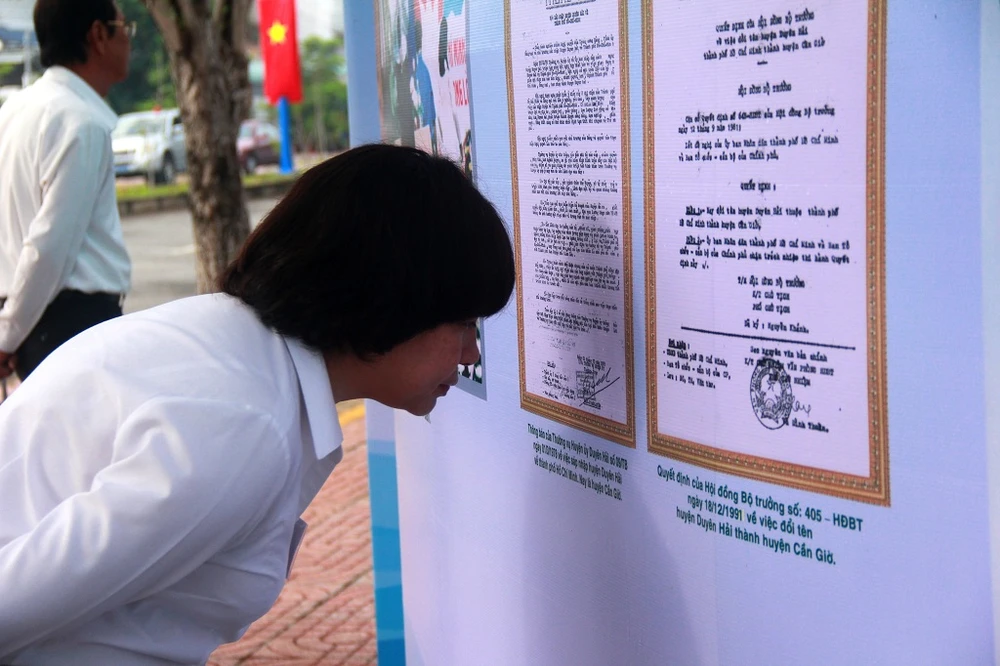 Người dân chăm chú xem lại tư liệu quyết định đổi tên huyện Duyên Hải thành huyện Cần Giờ từ năm 1991.