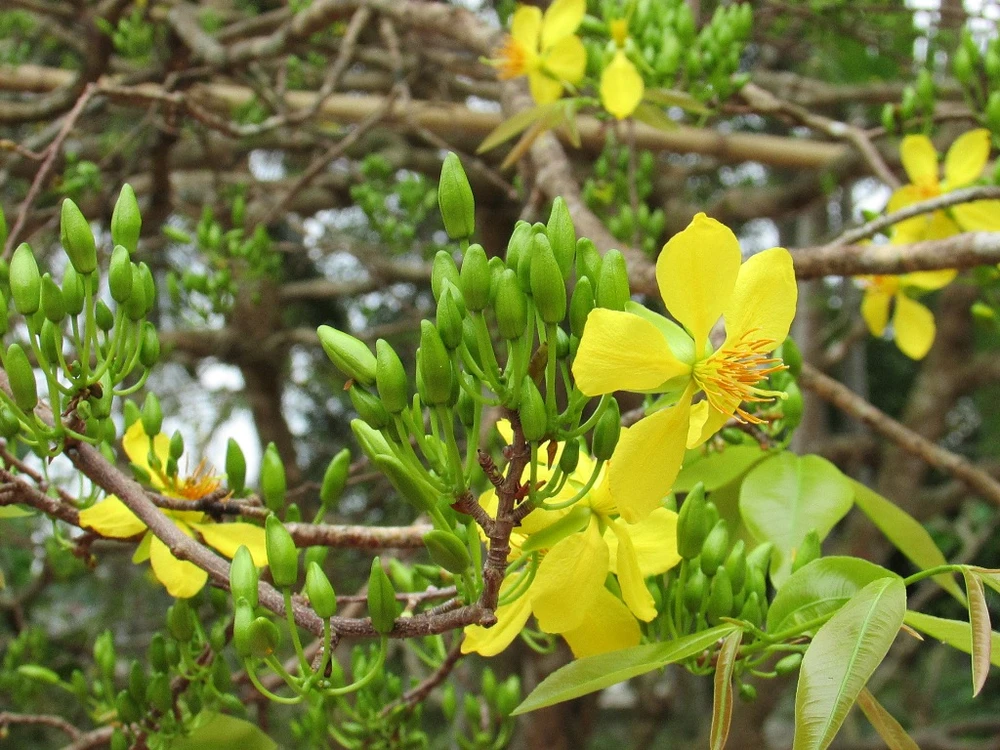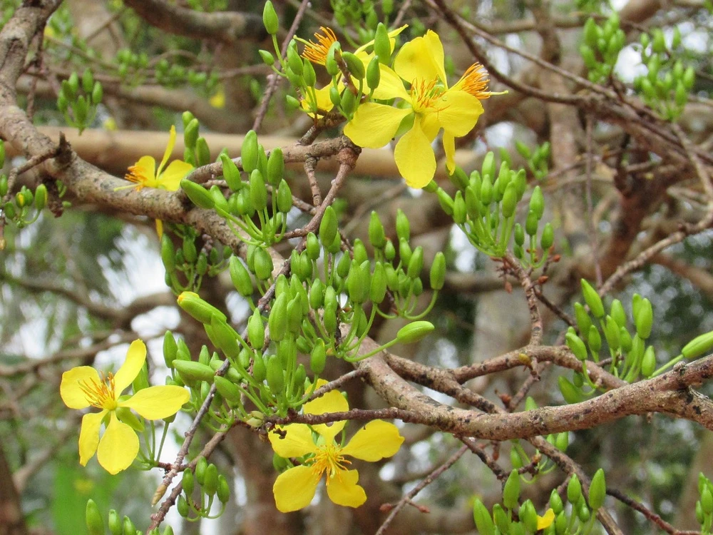 Những bông mai 5 cánh vàng mỏng manh điểm xuyết trên một tán cây rộng lớn chíu chít những nụ xanh mơn man gọi mùa xuân về.