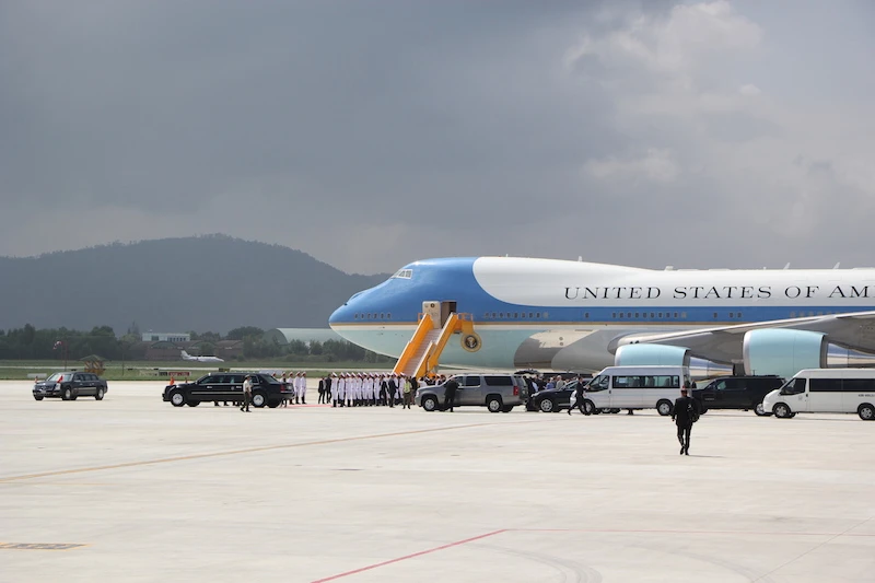 Air Force One còn chở theo cả đoàn hộ tống ông Trump. Ảnh: LÊ PHI