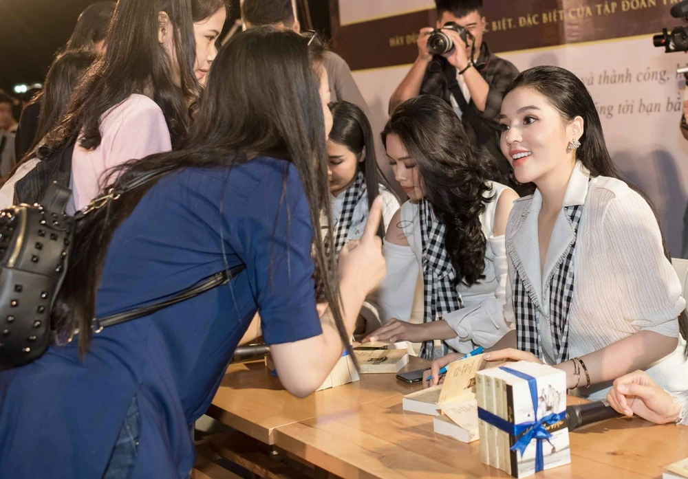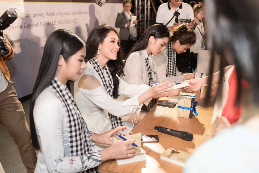 Các người đẹp ký tặng sách cho các bạn trẻ.