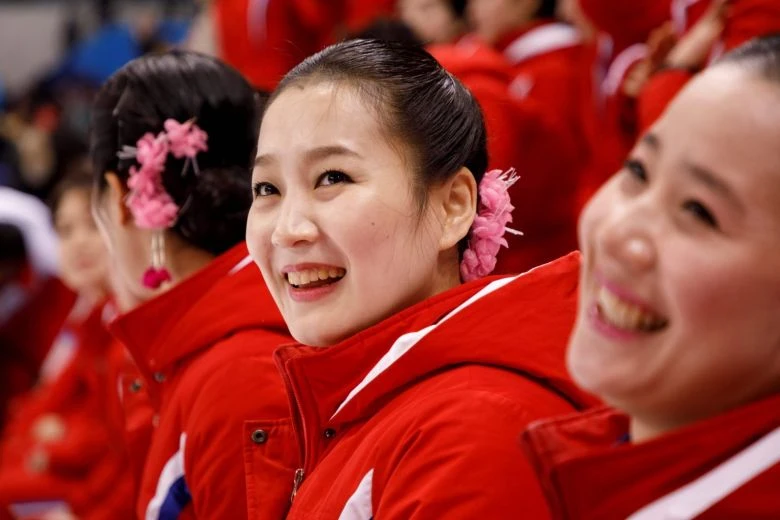 200 cô gái là nữ quân nhân Triều Tiên xinh đẹp như những nàng tiên trong trang phục sang trọng và có nét đẹp đậm chất Triều Tiên cổ vũ cho đội Hockey.