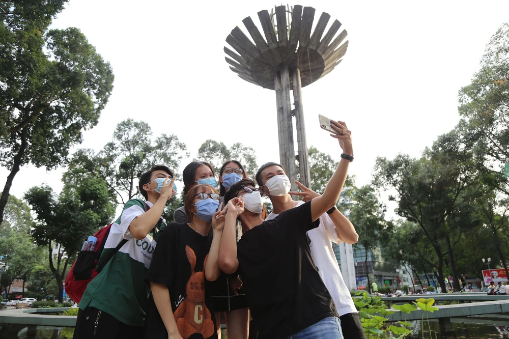 Khi tổ chức sự kiện thì sẽ chặn các hướng giao thông từ bốn hướng vào hồ Con Rùa. Các hoạt động sẽ được mở rộng xuống lòng đường. Trong ảnh: Nhóm sinh viên trường ĐH Kinh tế TP.HCM chụp hình với hồ Con Rùa khi tới đây vui chơi.