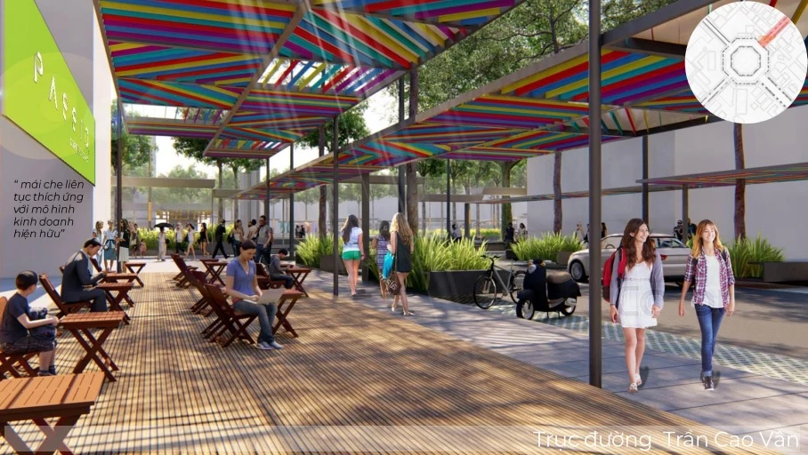 Các tuyến đường Võ Văn Tần, Phạm Ngọc Thạch, Trần Cao Vân sẽ được xây dựng hệ thống mái che dọc các trục vỉa hè, che nắng che mưa với tổng chiều dài 3.200 m. Ảnh: Theo báo cáo phương án cải tạo cảnh quan hồ Con Rùa.