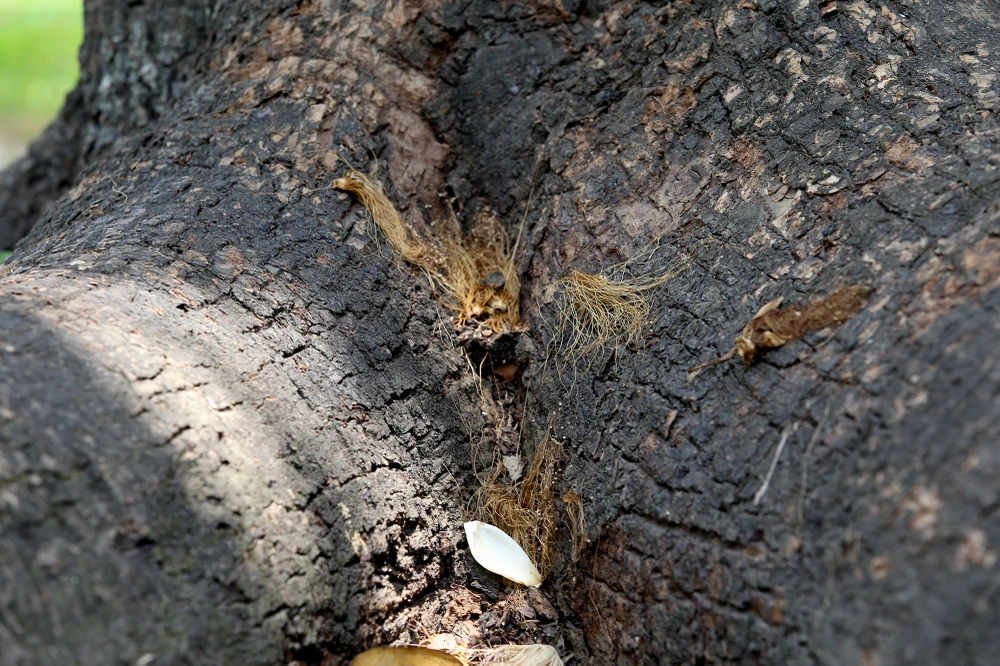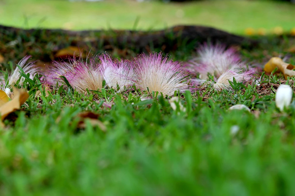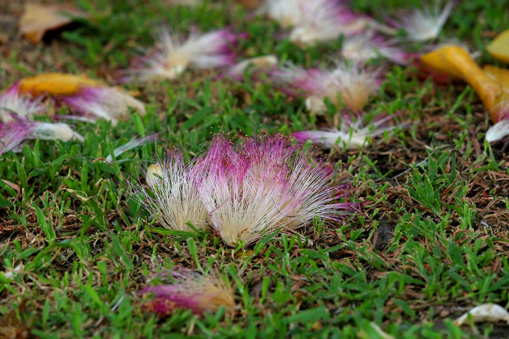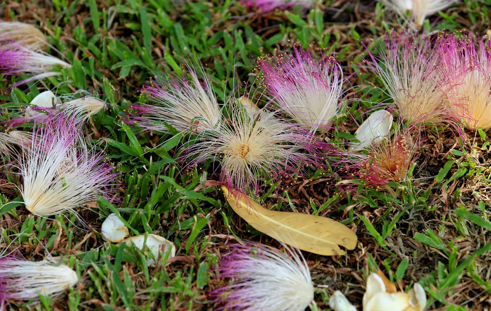 Những hoa bàng vuông rụng và khô héo dưới gốc cây.