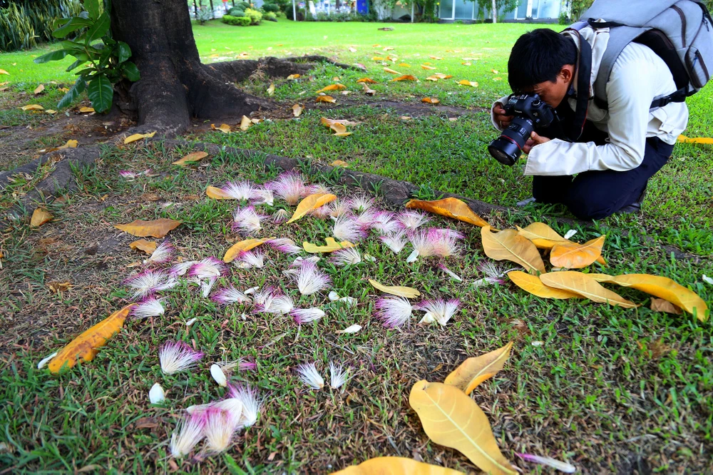Mỗi sáng khi người dân đi tập thể dục bên kênh Nhiêu Lộc lại được thấy những bông hoa màu trắng tím rụng dưới thảm cỏ toát lên vẻ đẹp khó tả.