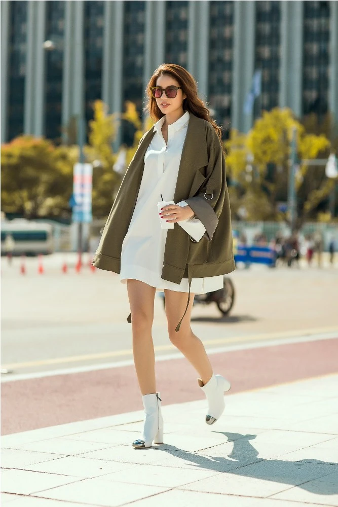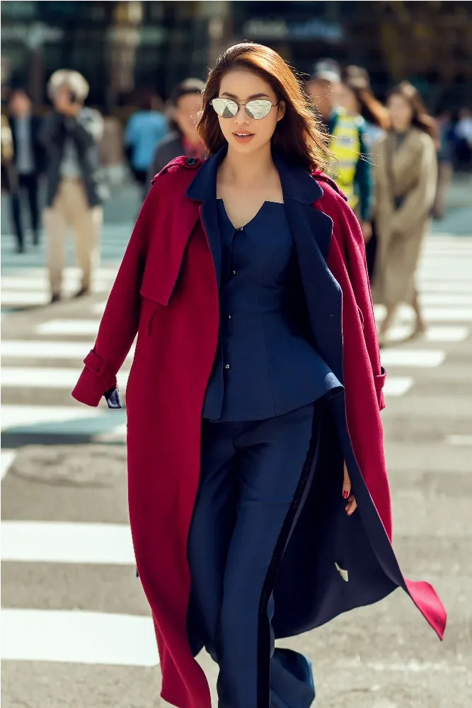 Sải bước trên đường phố Seoul, Phạm Hương thu hút ống kính máy ảnh với cách phối đồ thời thượng và thần thái tươi tắn. Gam màu bộ đội, màu carmel vẫn là những gam màu hot của mùa đông.