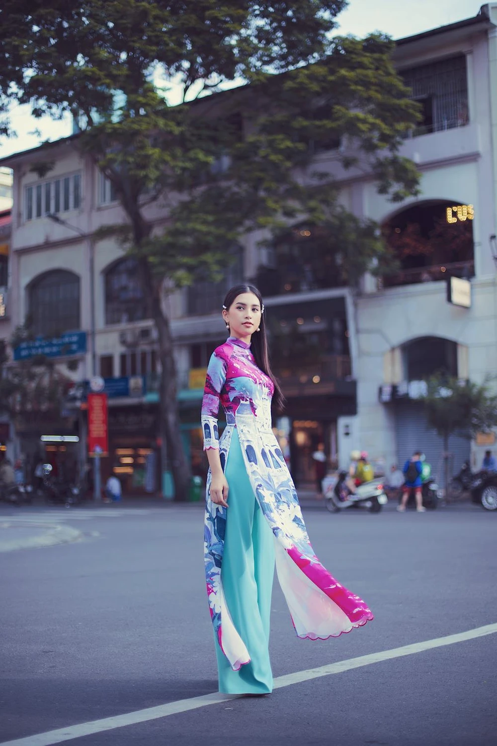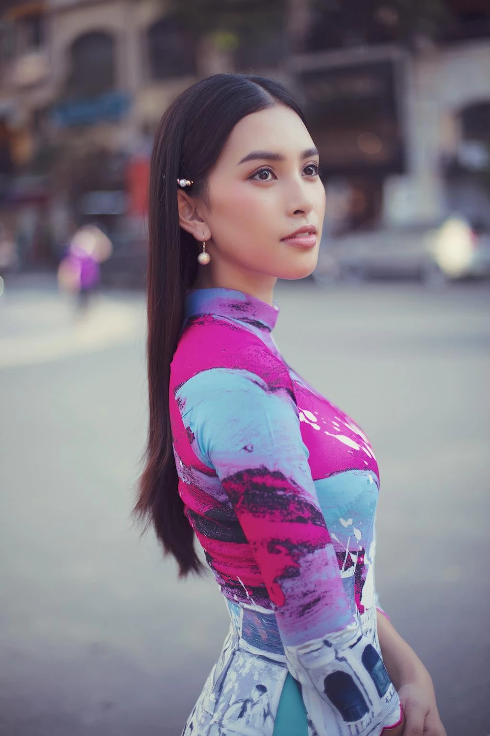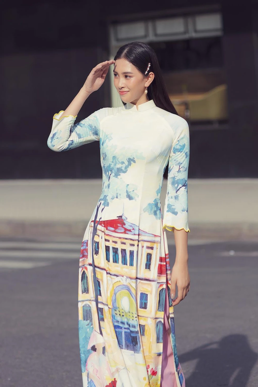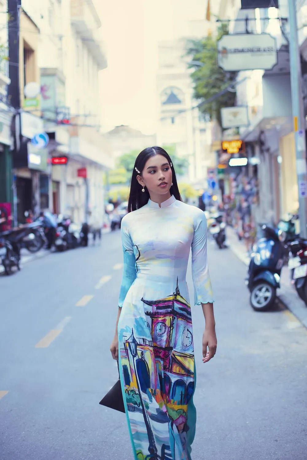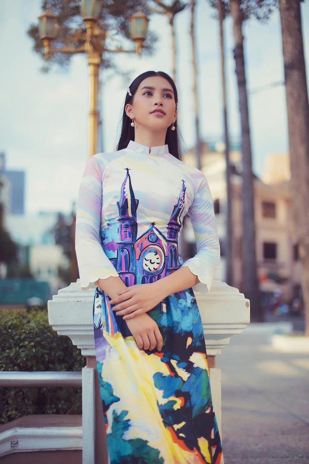 Tiểu Vy thướt tha trong bối cảnh Sài Gòn xưa pha lẫn hiện đại.
