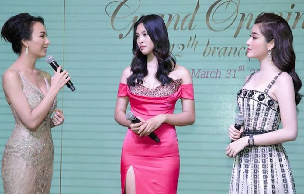Hoa hậu Ngọc Diễm trong vai trò MC của sự kiện trò chuyện cùng Tiểu Vy và Huyền My.