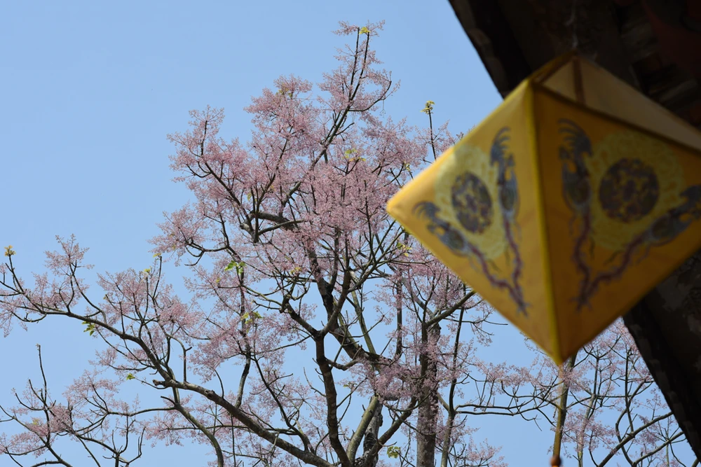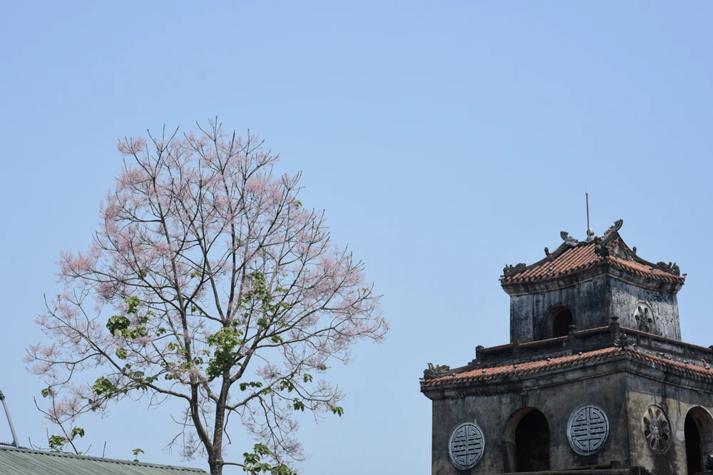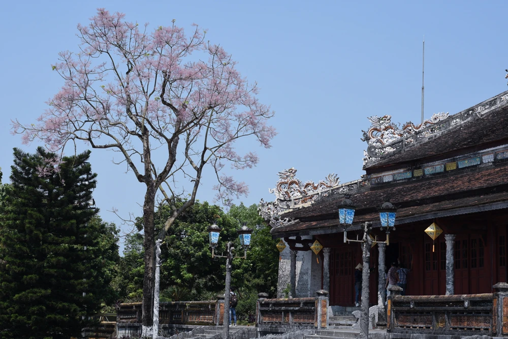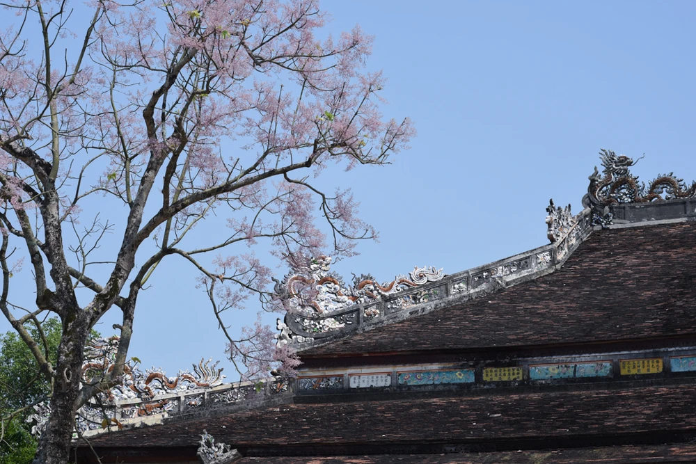Vào những ngày giữa tháng 2 và tháng 3 âm lịch, du khách đến Huế có thể chiêm ngưỡng sắc hoa ngô đồng bên kiến trúc cổ kính của cung đình xưa - một vẻ đẹp Huế "chẳng nơi nào có được". Ảnh: NGUYỄN DO
