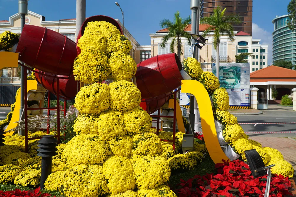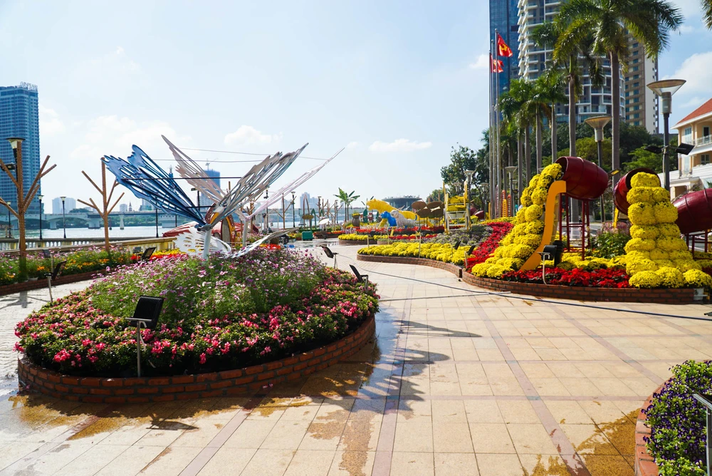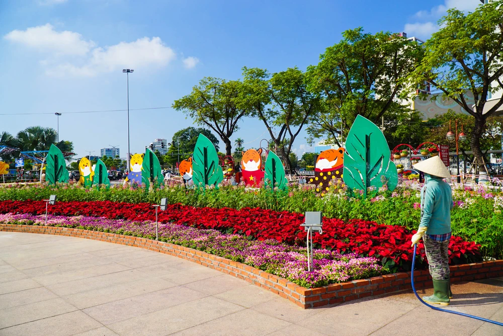 Ngày 27-1 (25 tháng Chạp), công nhân đang tất bật hoàn thành những phần còn lại tại đường hoa Đà Nẵng để mở cửa phục vụ người dân và du khách vui xuân bắt đắt đầu từ ngày 30-1 (ngày 28 tháng Chạp).