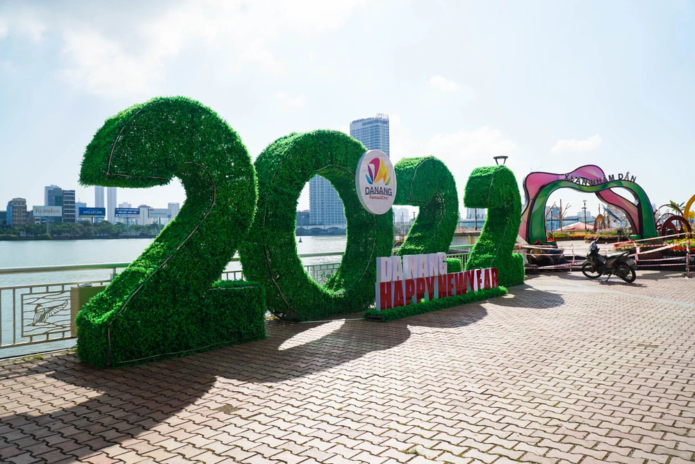 Chữ số 2022 được công nhân tạo hình từ những tiểu cảnh nhỏ, nổi bật tại khu vực cổng của đường hoa Đà Nẵng ở đường Bạch Đằng. Ảnh; BT.