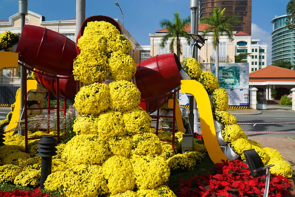 Hoa đổ thành thác từ những chiếc trống. Ảnh: BT.