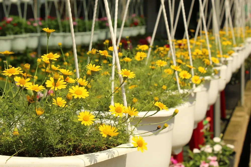Những chậu cúc hương bừng sáng được treo ngay ngắn ở lối vào của một nhà vườn.