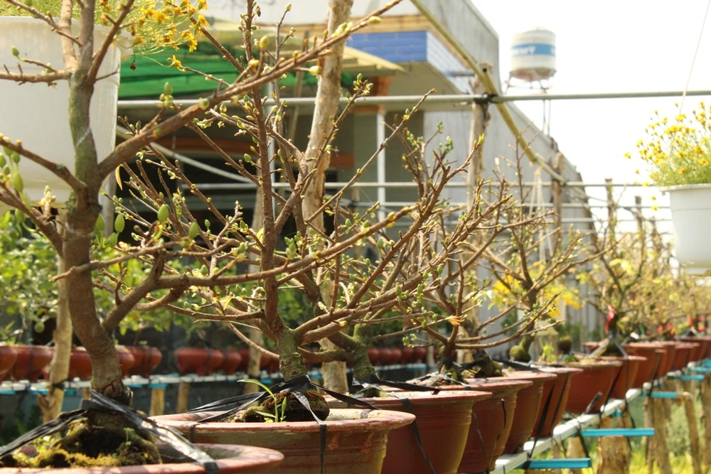 Những chậu mai cũng được sắp hàng ngăn nắp.