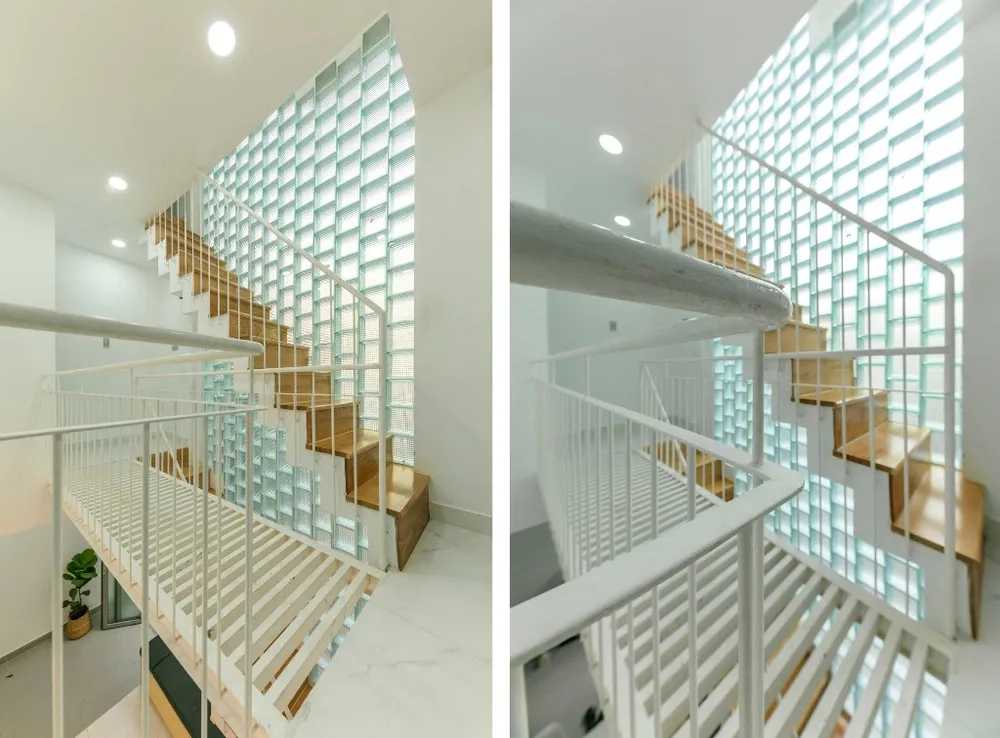 Nhóm thiết kế bố trí cầu thang men theo mặt tiền, đơn giản và có tone màu trắng.