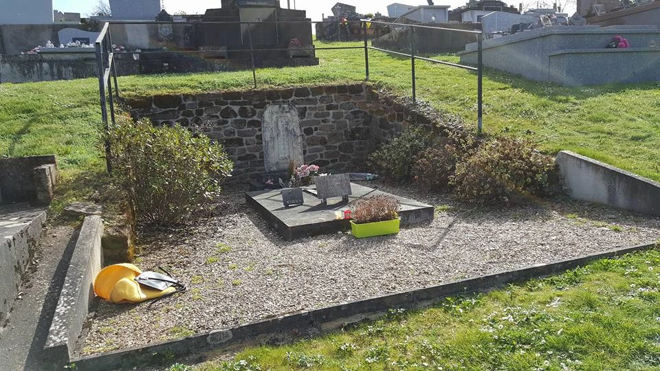 Ngôi mộ được đào xuống sau lưng một bức vách nhỏ lát đá, có bó hoa chứng tỏ có người lui tới.