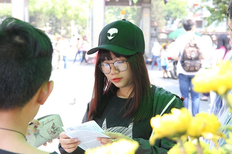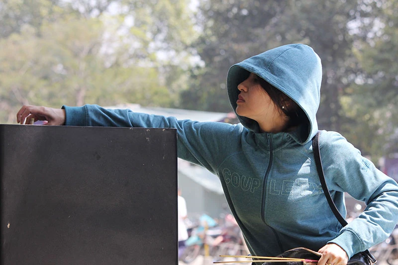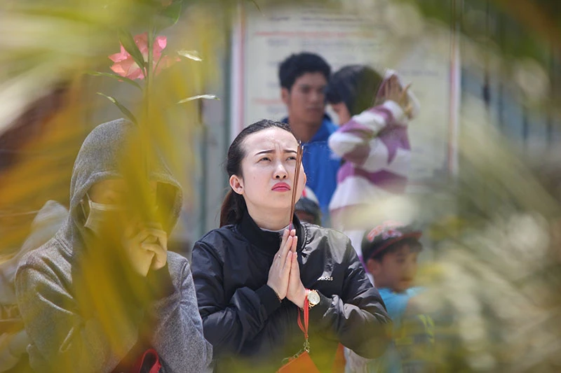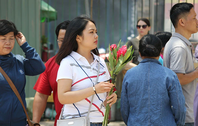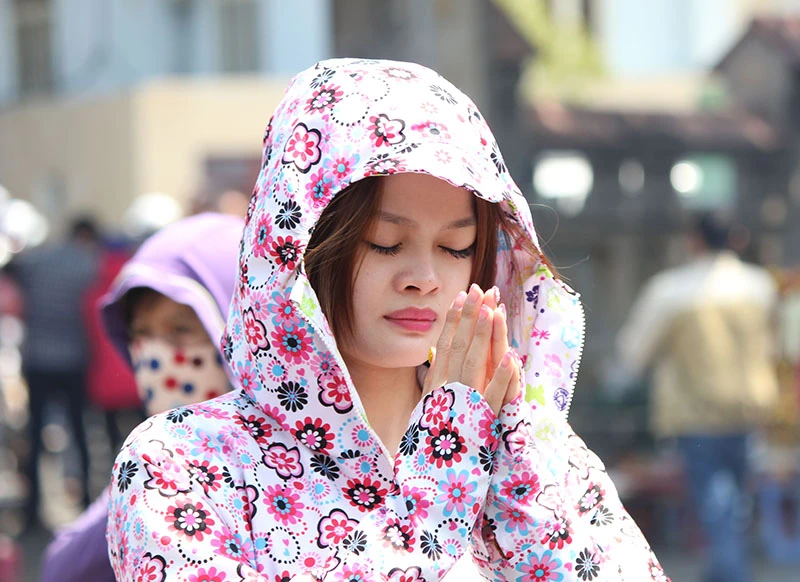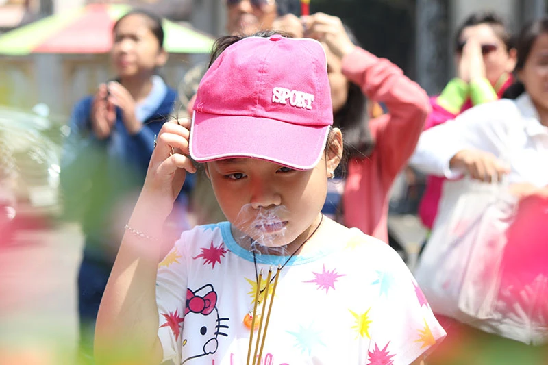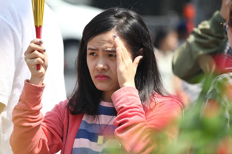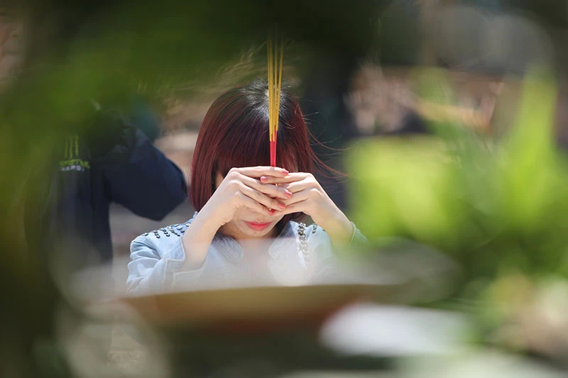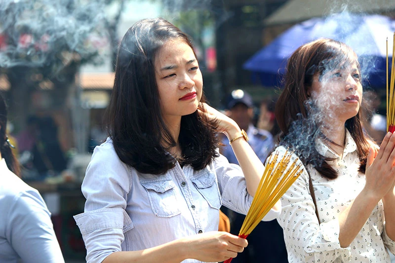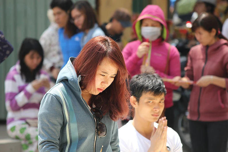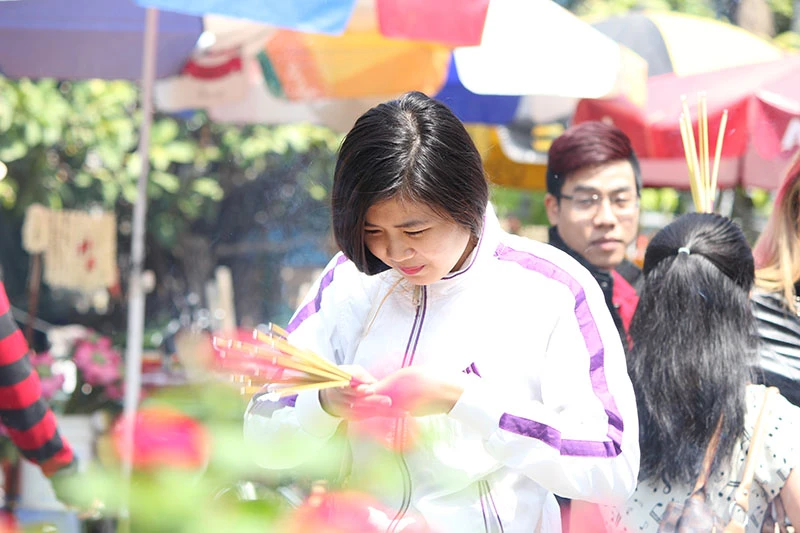 9 giờ sáng, lượng người đổ về các chùa mỗi lúc một đông lên. Giữa trưa nắng, những bóng hồng xinh tươi chen vào giữa dòng người thắp hương cầu an cho một năm mới thuận lợi.