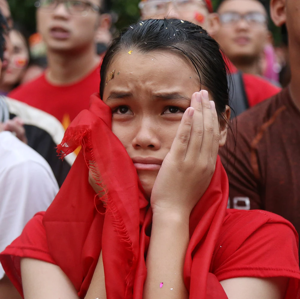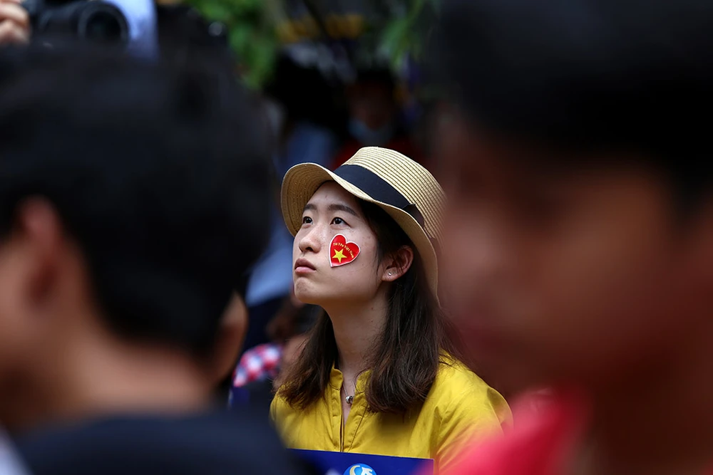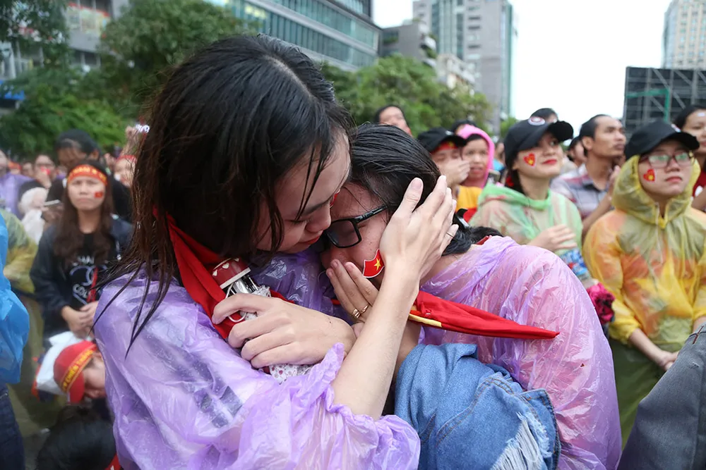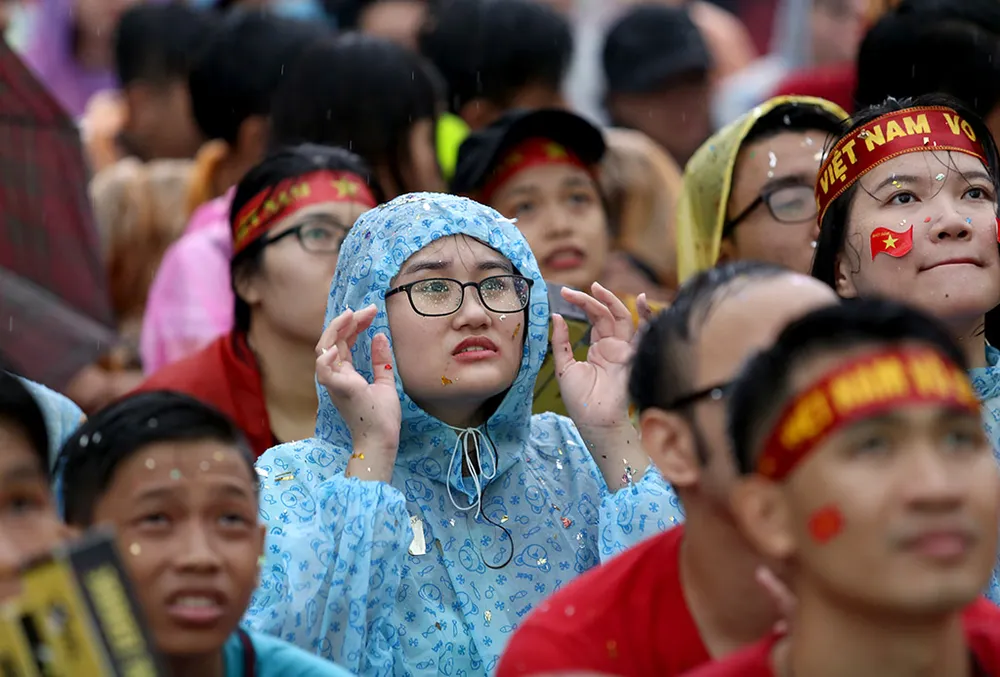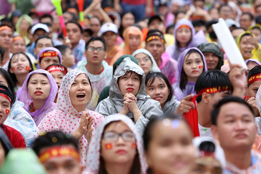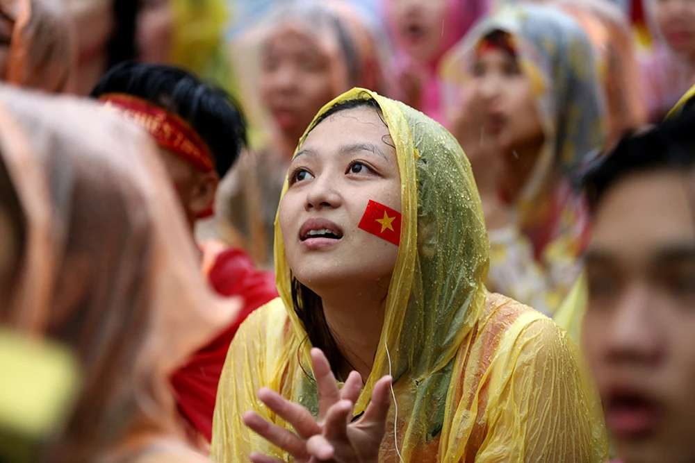 Cùng ngắm những bóng hồng xinh đẹp diện áo cờ đỏ sao vàng, đeo khẩu hiệu Việt Nam chiến thắng, đội mưa để cổ vũ đội tuyển: