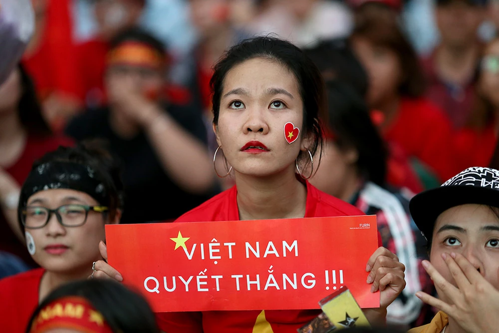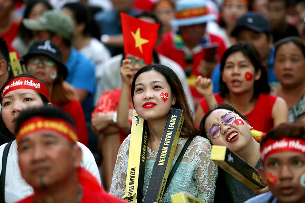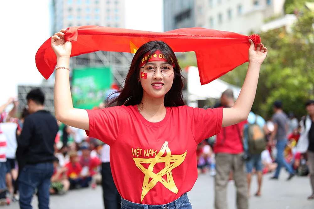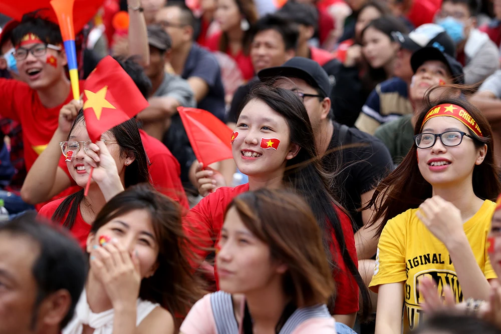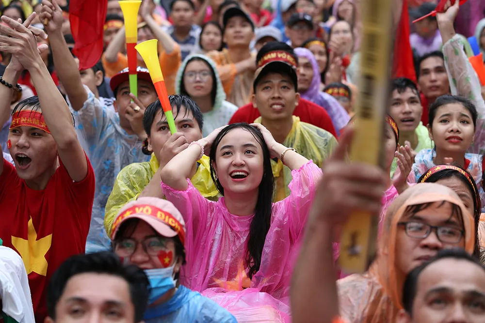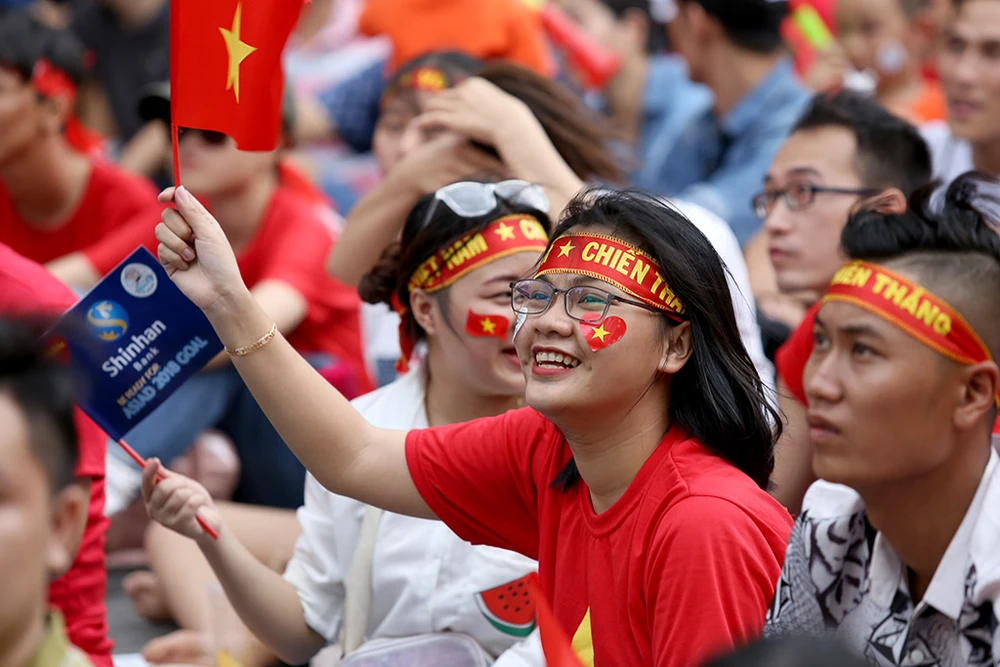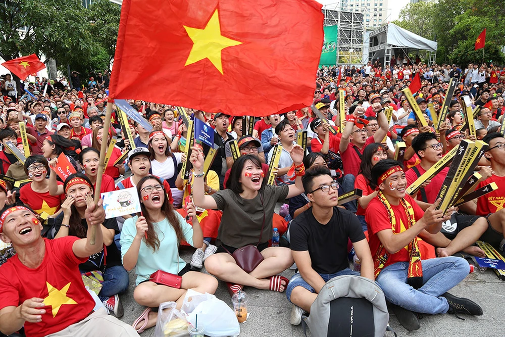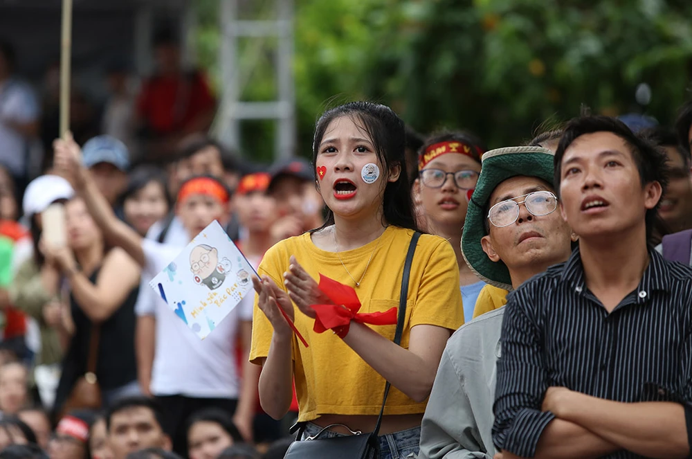 Trước trận đấu một tiếng đồng hồ, hàng ngàn cổ động viên đã có mặt tại phố đi bộ Nguyễn Huệ (quận 1, TP.HCM) để cổ vũ Olympic Việt Nam thi đấu tranh huy chương đồng với Olympic UEA.