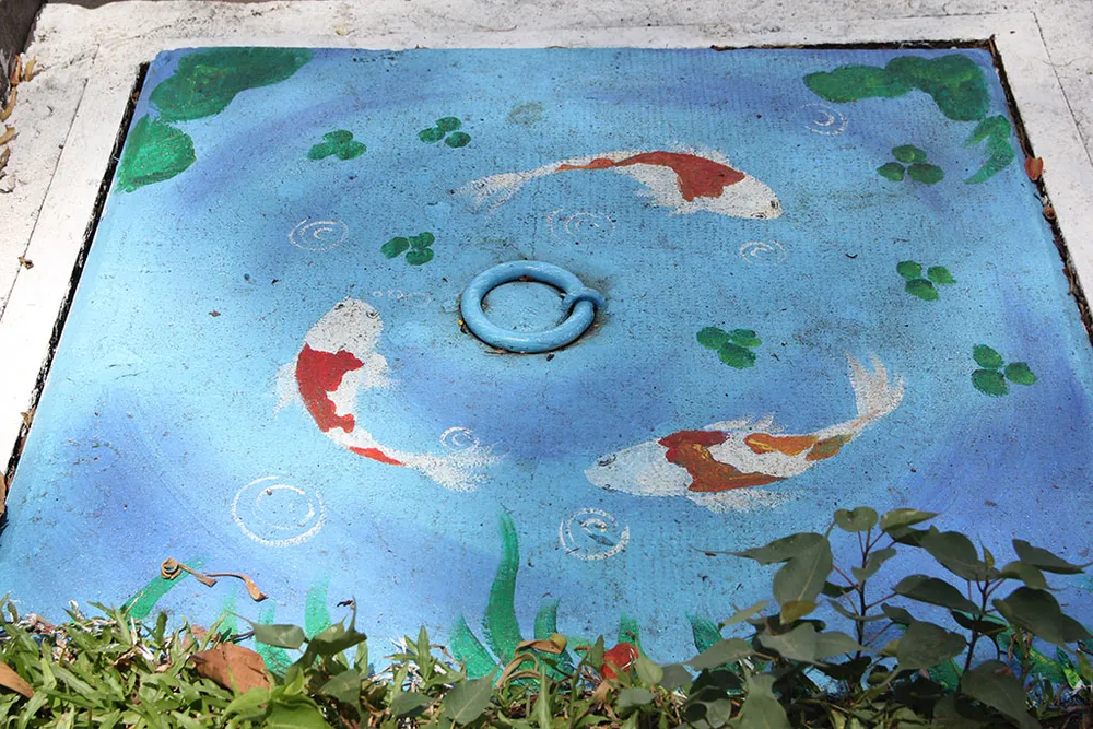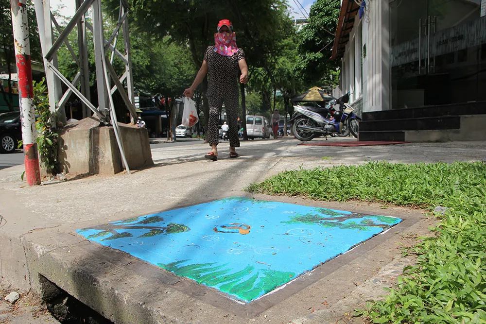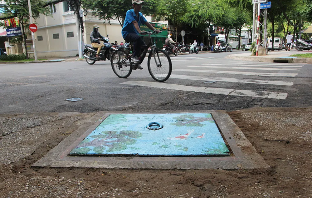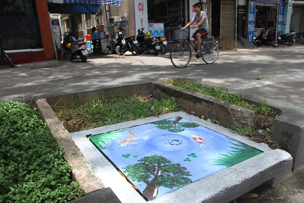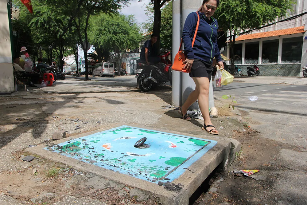 Nắp cống được vẽ hình những chú cá đang bơi trên đường Trần Hưng Đạo.