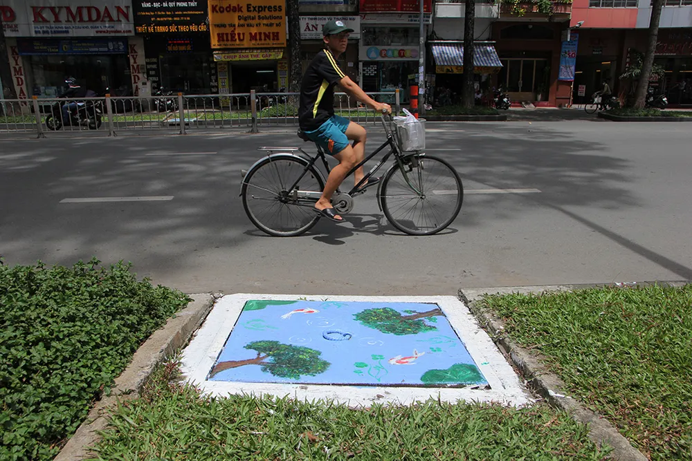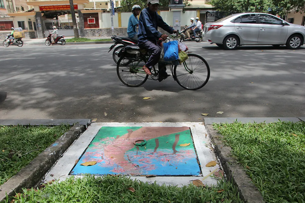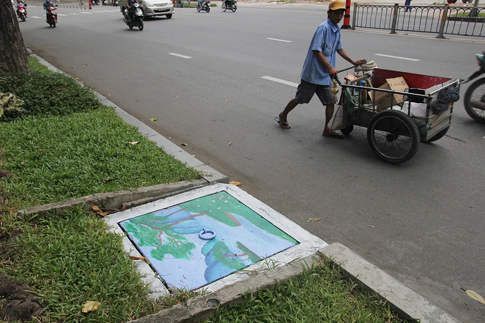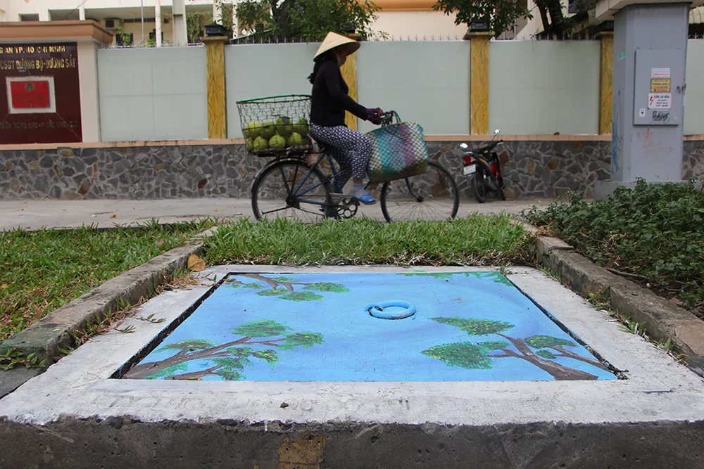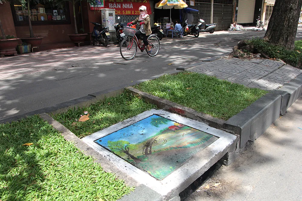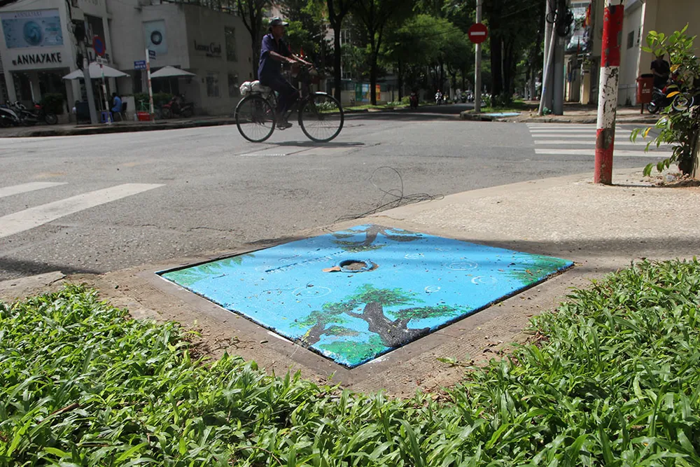 Nắp cống được vẽ tranh tại ngã tư Phùng Khắc Khoan - Nguyễn Văn Thủ.