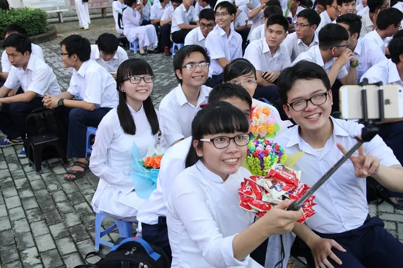 Các nữ sinh tự sướng mọi lúc. Ảnh: HOÀNG GIANG