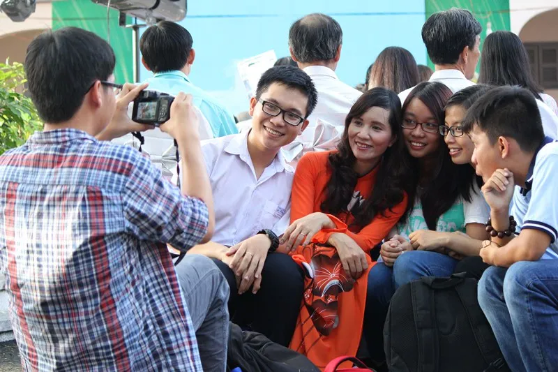 Chụp ảnh lưu niệm với cô giáo "xì teen". Ảnh: HOÀNG GIANG