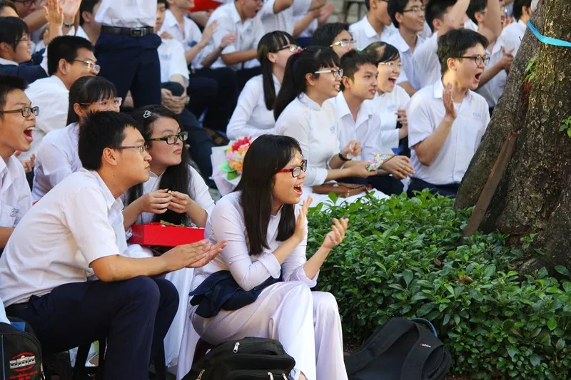 Khối học sinh lớp 12 cổ vũ các tiết mục văn nghệ. Ảnh: HOÀNG GIANG